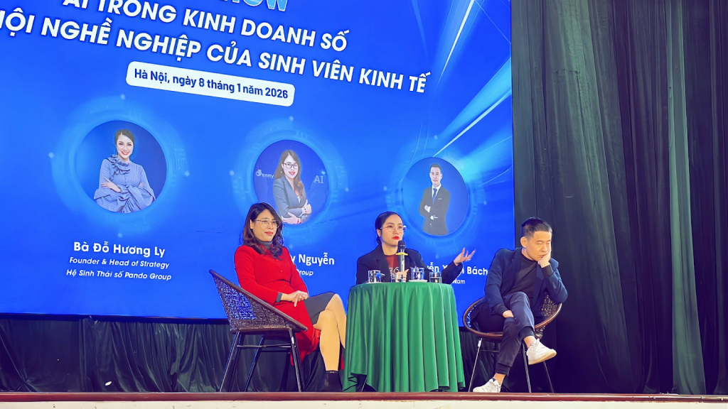 Điểm nhấn nổi bật của chương trình là phiên talkshow chuyên đề với sự tham gia của các doanh nhân, nhà lãnh đạo đang trực tiếp ứng dụng AI trong đào tạo, marketing và kinh doanh số. Trong đó, những chia sẻ từ Pando Group đã giúp sinh viên tiếp cận các ví dụ thực tế, sát với môi trường doanh nghiệp hiện nay.